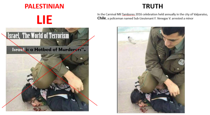Pallywood deceitfully presents an image of an incident in Chile as if the perpetrator is an Israeli soldier.